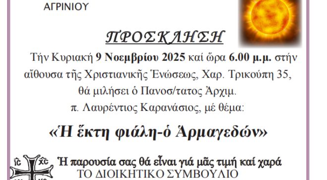 Και την φετινή χρονιά ο αρχιμ. π. Λαυρέντιος Καρανάσιος , ιεροκήρυκας της Ιεράς Μητροπόλεως Αιτωλίας και Ακαρνανίας , θα συνεχίσει την ερμηνεία του βιβλίου της Αποκαλύψεως στις εσπερινές ομιλίες της Χριστιανικής Ενώσεως Αγρινίου. Την προσεχή Κυριακή λοιπόν 9 Νοεμβρίου 2025 και ώρα 6:00 μ.μ. θα αναπτύξει το ενδιαφέρον θέμα “η έκτη φιάλη – ο Αρμαγεδών”. Η παρουσία σας θα είναι για μας τιμή και χαρά.