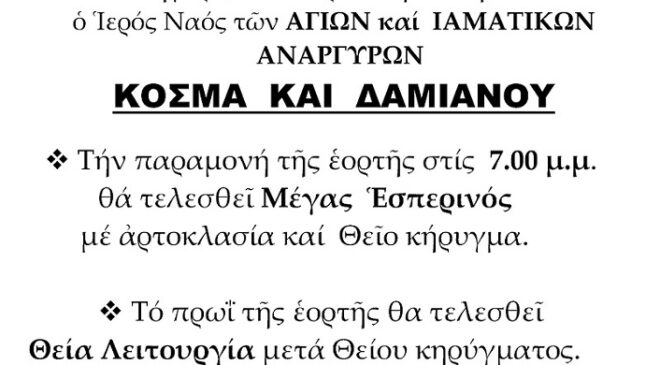 Η Χριστιανική Ένωσις Αγρινίου ανακοινώνει το πρόγραμμα των ακολουθιών στο εορτάζον παρεκκλήσιο των θαυματουργών Αγίων Αναργύρων Κοσμά και Δαμιανού, οδός Χαριλάου Τρικούπη 37 στο Αγρίνιο. Δευτέρα 30 Ιουνίου και ώρα 7:00 μ.μ. θα τελεστεί ο πανηγυρικός εσπερινός με αρτοκλασία και θείο κήρυγμα, προεξάρχοντος του πρωτοσυγκέλλου της Ιεράς Μητροπόλεώς μας π. Θεοκλήτου. Τρίτη πρωί και ώρα 7:00 π.μ. θα ξεκινήσει ο όρθρος και θα ακολουθήσει η θεία λειτουργία μετά κηρύγματος στη μνήμη των Αγίων. Και το απόγευμα της Τρίτης ώρα 7:00 μ.μ. θα πραγματοποιηθεί ιερά παράκληση.