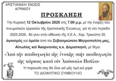 Η Χριστιανική Ένωσις Αγρινίου ανακοινώνει ότι η επίσημη έναρξη της πνευματικής διακονίας της για το τρέχον ιεραποστολικό έτος θα γίνει την Κυριακή 12 Οκτωβρίου 2025 και ώρα 7:00 μ.μ. Ο Σεβασμιώτατος Μητροπολίτης μας κ. Δαμασκηνός θα τελέσει την ακολουθία του αγιασμού και ακολούθως θα απευθύνει ομιλία με θέμα “από την παιδαγωγία της ενοχής στην παιδαγωγία της χάριτος κατά τον Απόστολο Παύλο”. Η παρουσία σας θα είναι για μας τιμή και χαρά.