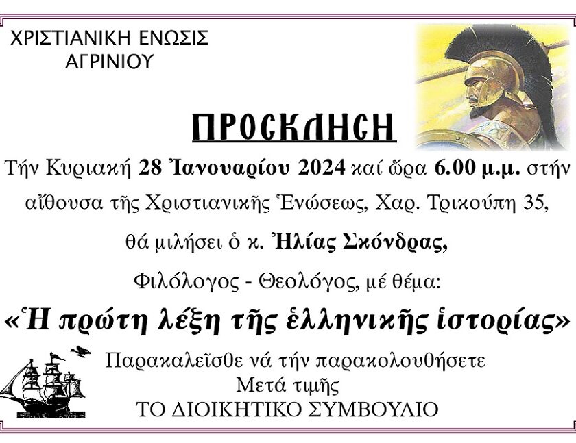 Η Χριστιανική Ένωσις Αγρινίου ανακοινώνει ότι την προσεχή Κυριακή 28 Ιανουαρίου και ώρα 6:00 μ.μ. στην αίθουσά της θα έλθει να μιλήσει ο εκ Πάτρας φιλόλογος, θεολόγος, συγγραφέας, τέως διευθυντής γυμνασίου κ. Ηλίας Σκόνδρας με θέμα: η πρώτη λέξη της ελληνικής ιστορίας.