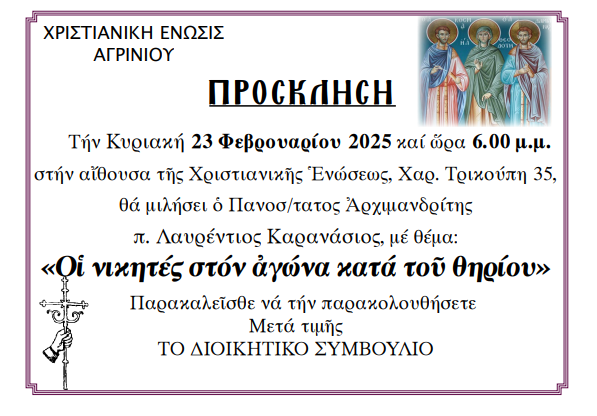 Την Κυριακή 23-2-2025 και ώρα 6:00 μ.μ. στην αίθουσα της Χριστιανικής Ενώσεως Αγρινίου θα μιλήσει ο αρχιμ. Λαυρέντιος Καρανάσιος, ιεροκήρυξ της Ιεράς Μητροπόλεως Αιτωλίας και Ακαρνανίας, με θέμα “Οι νικητές στον αγώνα κατά του θηρίου” (συνέχιση της ερμηνείας στην Αποκάλυψη του Ευαγγελιστή Ιωάννη).