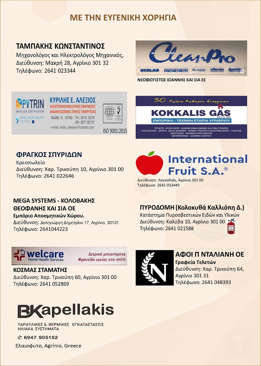 Σημαντική ήταν η συμβολή και η στήριξη των χορηγών, για τους οποίους η ευγνωμοσύνη μας είναι μεγάλη: μηχανολόγος μηχανικός Κώστας Ταμπάκης, είδη καθαρισμού Νεοφώτιστος Ιωάννης, υγραέρια Κόκκαλης, ηλεκτρολόγος Αλέξιος Κυριλής, φροντίδα υγείας well care Κοσμάς Σταμάτης, κρεοπωλείο Σπύρος Φράγκος, αποσμητικά mega systems Κολοβάκης, υδραυλικός Βασίλειος Καπελλάκης, φρούτα international fruit, πυροσβεστικά είδη Καλλιόπη Κολοκυθά, γραφείο τελετών Νταλιάνης.