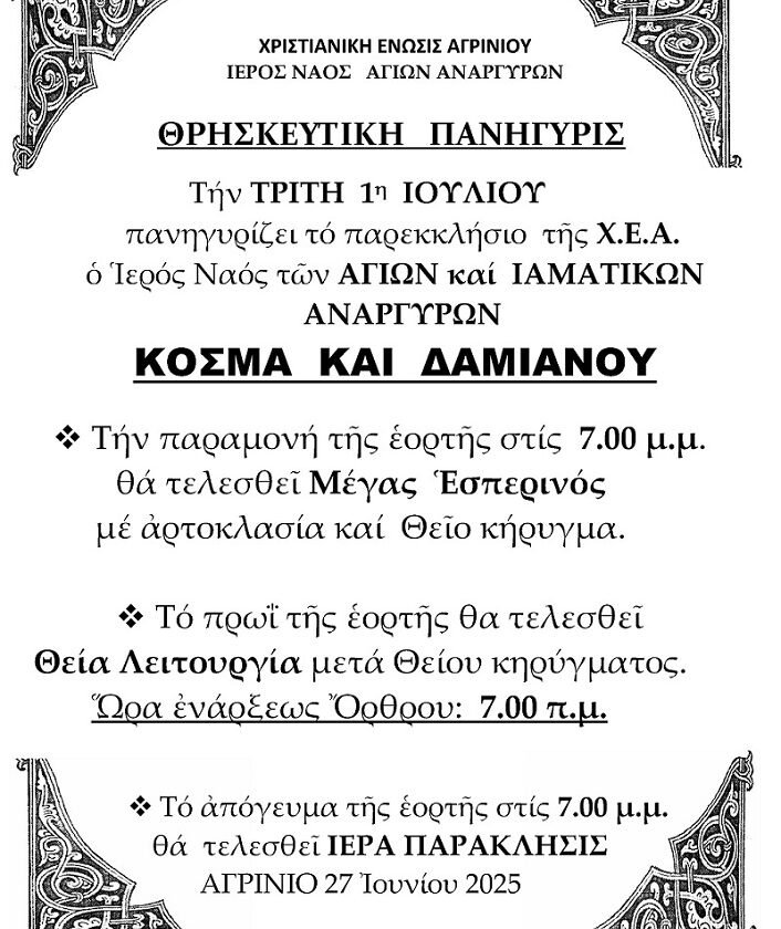 Η Χριστιανική Ένωσις Αγρινίου ανακοινώνει το πρόγραμμα των ακολουθιών στο εορτάζον παρεκκλήσιο των θαυματουργών Αγίων Αναργύρων Κοσμά και Δαμιανού, οδός Χαριλάου Τρικούπη 37 στο Αγρίνιο.