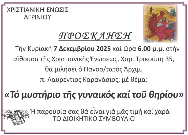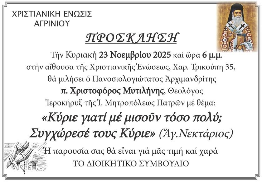 Με την αρμόζουσα ιεροπρέπεια εορτάσθηκε η μνήμη των Αγίων Αναργύρων Κοσμά και Δαμιανού στο παρεκκλήσιο της Χριστιανικής Ενώσεως Αγρινίου. Στην ακολουθία του εσπερινού προεξήρχε ο αρχιερατικός επίτροπος Αγρινίου αρχιμ. π. Νεκτάριος Τριάντης, ο οποίος και ομίλησε. Το πρωί του Σαββάτου ο Σεβασμιώτατος Μητροπολίτης Αιτωλίας και Ακαρνανίας κ. Δαμασκηνός τέλεσε την θεία λειτουργία και απηύθυνε κατάλληλο λόγο, ενώ μνημονεύθηκαν οι αείμνηστοι δωρετές – ευεργέτες και μέλη της Χ.Ε.Α. και του γηροκομείου. Το απόγευμα της εορτής τελέσθηκε η παράκληση προς τους Αγίους. Εκτός από τον υπεύθυνο του παρεκκλησίου αρχιμ. π. Λαυρέντιο Καρανάσιο,…