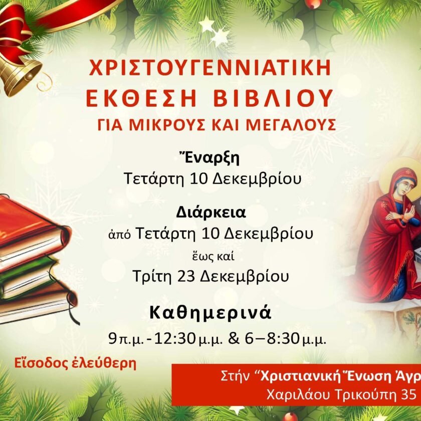Η δράση θα πραγματοποιείται στον πρώτο όροφο του πνευματικού μας κέντρου (οδός Χαρ. Τρικούπη 35, δίπλα στον ιερό ναό των Αγίων Αναργύρων) από την Τετάρτη 10 Δεκεμβρίου έως και την Τρίτη 23 Δεκεμβρίου 2025 σε δύο πρωινές βάρδιες καθημερινά: