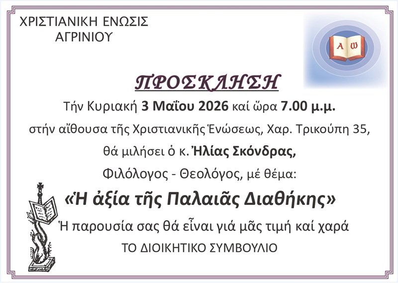 Την Δευτέρα 22 Απριλίου 2024 και ώρα 7:00 μ.μ. στην αίθουσα της Χριστιανικής Ενώσεως Αγρινίου (οδός Χαριλάου Τρικούπη 35) θα λάβει χώρα εκδήλωση – αφιέρωμα στα Πάθη του Κυρίου Ιησού Χριστού. Θα περιλαμβάνει εκκλησιαστικούς ύμνους από χορωδία ιεροψαλτών συνοδεία ισοκρατήματος, προβολή και ομιλία από τον πανοσιολογιώτατο αρχιμ. Λαυρέντιο Καρανάσιο με θέμα “η κάθοδος του Κυρίου στον Άδη“. Πρόκειται για μια πνευματική ευκαιρία, ώστε να ετοιμάσουμε την ψυχή μας εν όψει της Μεγάλης Εβδομάδας.