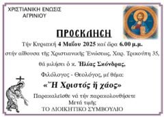 Στην αίθουσα της Χριστιανικής Ενώσεως Αγρινίου την Κυριακή 4 Μαΐου 2025 και ώρα 6:00 μ.μ. θα μιλήσει ο φιλόλογος – θεολόγος, τέως γυμνασιάρχης κ. Ηλίας Σκόνδρας με θέμα <ή Χριστός ή χάος>. Σας περιμένουμε!