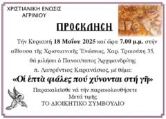 Την Κυριακή 18 Μαΐου και ώρα 7:00 μ.μ. στην αίθουσα της Χριστιανικής Ενώσεως Αγρινίου θα πραγματοποιηθεί η τελευταία ομιλία προς το κοινό για το ιεραποστολικό έτος 2024 – 2025. Ο πανοσιολογιώτατος αρχιμανδρίτης π. Λαυρέντιος Καρανάσιος, ιεροκήρυκας της Ιεράς Μητροπόλεως Αιτωλίας και Ακαρνανίας, θα συνεχίσει την ερμηνεία στην Αποκάλυψη του Ευαγγελιστή Ιωάννη , αναπτύσσοντας το θέμα “οι επτά φιάλες που χύνονται στη γη”. Είμαστε προσκεκλημένοι να παρακολουθήσουμε!
