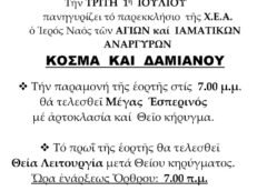Η μνήμη των θαυματουργών Αγίων Αναργύρων θα τιμηθεί στο εορτάζον παρεκκλήσιο της Χριστιανικής Ενώσεως Αγρινίου (οδός Χαρ. Τρικούπη 37) με το ακόλουθο πρόγραμμα: Παρασκευή 31/10 και ώρα 6:00 μ.μ. ο πανηγυρικός εσπερινός με αρτοκλασία και θεία κήρυγμα. Ανήμερα της εορτής (Σάββατο πρωί) θα ψαλλεί όρθρος και εν συνεχεία ο Σεβασμιώτατος Μητροπολίτης μας κ. Δαμασκηνός θα τελέσει αρχιερατική θεία λειτουργία μετά κηρύγματος, ενώ θα ακολουθήσει μνημόσυνο των ευεργετών και δωρητών του Γηροκομείου και της Χ.Ε.Α. Το απόγευμα του Σαββάτου ώρα 5:00 μ.μ. θα γίνει εσπερινός και παράκληση στους Αγίους Αναργύρους. Το…