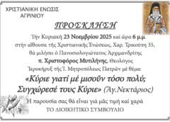 Την Κυριακή 23 Νοεμβρίου 2025 και ώρα 6:00 μ.μ. στην αίθουσα της Χριστιανικής Ενώσεως Αγρινίου θα μιλήσει ο αρχιμ. π. Χριστοφόρος Μυτιλήνης , ιεροκήρυκας της Ιεράς Μητροπόλεως Πατρών, με θέμα “Κύριε , γιατί με μισούν τόσο πολύ; Συγχώρεσέ τους, Κύριε”. Η παρουσία θα είναι για μας χαρά και τιμή.