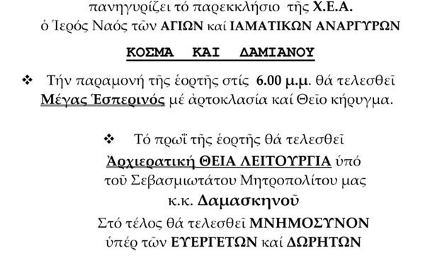 Η Χριστιανική Ένωσις Αγρινίου ανακοινώνει το πρόγραμμα των ακολουθιών στο εορτάζον παρεκκλήσιο των θαυματουργών Αγίων Αναργύρων Κοσμά και Δαμιανού, οδός Χαριλάου Τρικούπη 37 στο Αγρίνιο. Δευτέρα 30 Ιουνίου και ώρα 7:00 μ.μ. θα τελεστεί ο πανηγυρικός εσπερινός με αρτοκλασία και θείο κήρυγμα, προεξάρχοντος του πρωτοσυγκέλλου της Ιεράς Μητροπόλεώς μας π. Θεοκλήτου. Τρίτη πρωί και ώρα 7:00 π.μ. θα ξεκινήσει ο όρθρος και θα ακολουθήσει η θεία λειτουργία μετά κηρύγματος στη μνήμη των Αγίων. Και το απόγευμα της Τρίτης ώρα 7:00 μ.μ. θα πραγματοποιηθεί ιερά παράκληση.