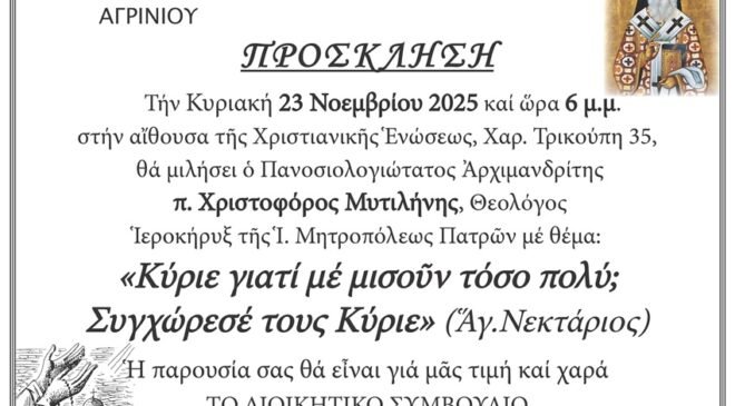 Την Κυριακή 18 Μαΐου και ώρα 7:00 μ.μ. στην αίθουσα της Χριστιανικής Ενώσεως Αγρινίου θα πραγματοποιηθεί η τελευταία ομιλία προς το κοινό για το ιεραποστολικό έτος 2024 – 2025. Ο πανοσιολογιώτατος αρχιμανδρίτης π. Λαυρέντιος Καρανάσιος, ιεροκήρυκας της Ιεράς Μητροπόλεως Αιτωλίας και Ακαρνανίας, θα συνεχίσει την ερμηνεία στην Αποκάλυψη του Ευαγγελιστή Ιωάννη , αναπτύσσοντας το θέμα “οι επτά φιάλες που χύνονται στη γη”. Είμαστε προσκεκλημένοι να παρακολουθήσουμε!